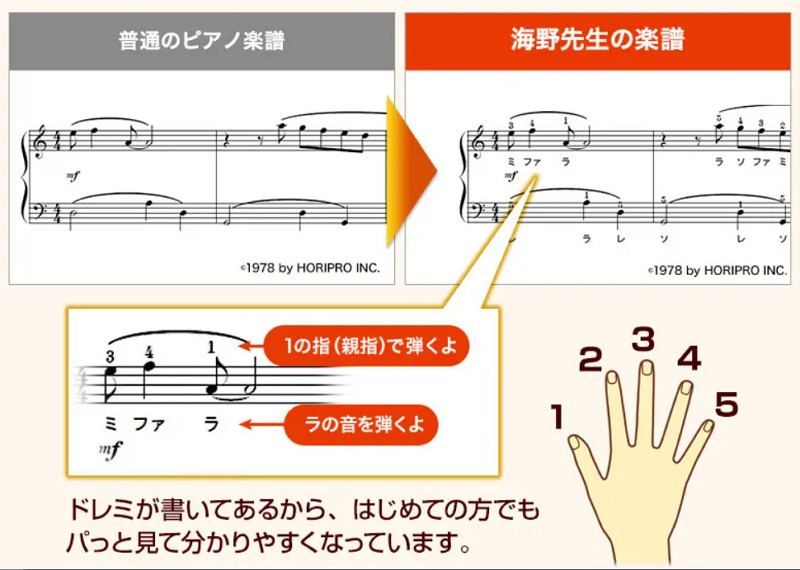 海野先生の楽譜には、ドレミが書いていて、そしてどの指で鍵盤を弾けばいいのかが書いてあります。