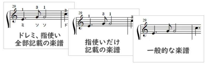 ドレミ・指番号の書いてある楽譜、指番号だけ書いてある楽譜、通常の楽譜。3つのパターンで徐々に楽譜に慣れることができます。