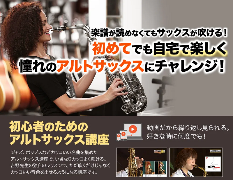 初心者の立場に立った丁寧でわかりやすい吉野先生のサックス教室でのレッスンを、そのままご自宅でも体験できるようにしたのが、今回のアルトサックス講座です。